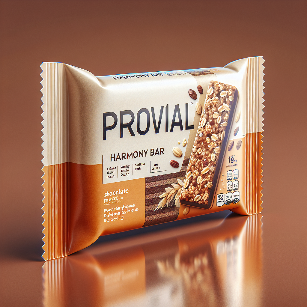 The ProVital Harmony Bar is presented in a sleek, standard flow-wrap bar wrapper—the most commercially accepted and practical packaging for snack bars. The material is a glossy, high-barrier plastic laminate to maintain freshness and shelf stability. The visual identity features a harmonious blend of rich chocolate brown, creamy vanilla, and warm caramel gold, accented with subtle flaxseed and oat motifs. A bold, easy-to-read product name is centered on the wrapper in modern, high-contrast lettering. Minimalist iconography and subtle, professional patterns create a sense of trust, sophistication, and vibrancy. The overall look is clean, inviting, and shelf-ready, specifically tailored to resonate with Gen X and Baby Boomer sensibilities: approachable, premium, and refreshingly unfussy.