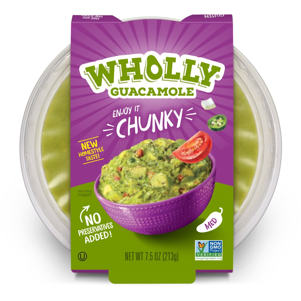 Manufacturer's Description: Take the delicious flavor of our guac anywhere you go with WHOLLY Guacamole Family Size Chunky medium-flavored guacamole bowl. Made with 100 percent Hass avocados, hand-scooped at the height of freshness, and a kick of serrano pepper, this medium-spiced recipe is sure to sizzle your senses. Add WHOLLY Guacamole to your sandwich or salad, create the perfect veggie dip, or enjoy it with tortilla chips for a tasty snack. Always ready to eat and with no preservatives added, we perfected the art of guacamole by keeping the nutrition and benefits found in delicious avocados. Our guac is gluten-free and Non-GMO. This 7.5-ounce, ready-made guacamole is the perfect appetizer for game night and is sure to leave your whole crowd happy.